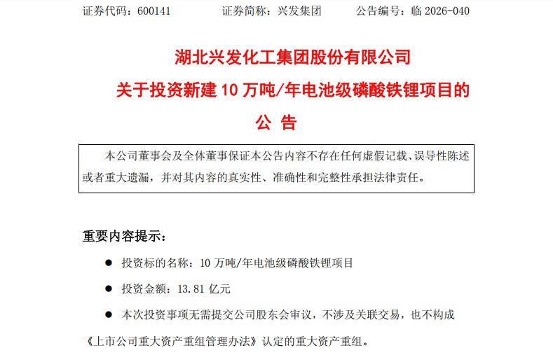 同一天,兴发集团还发布公告称,为进一步完善公司新能源产业布局,丰富产品种类,提升新能源产业市场影响力和综合竞争力,公司全资孙公司内蒙古兴发科技有限公司拟投资13.81亿元,建设10万吨/年电池级磷酸铁锂项目。